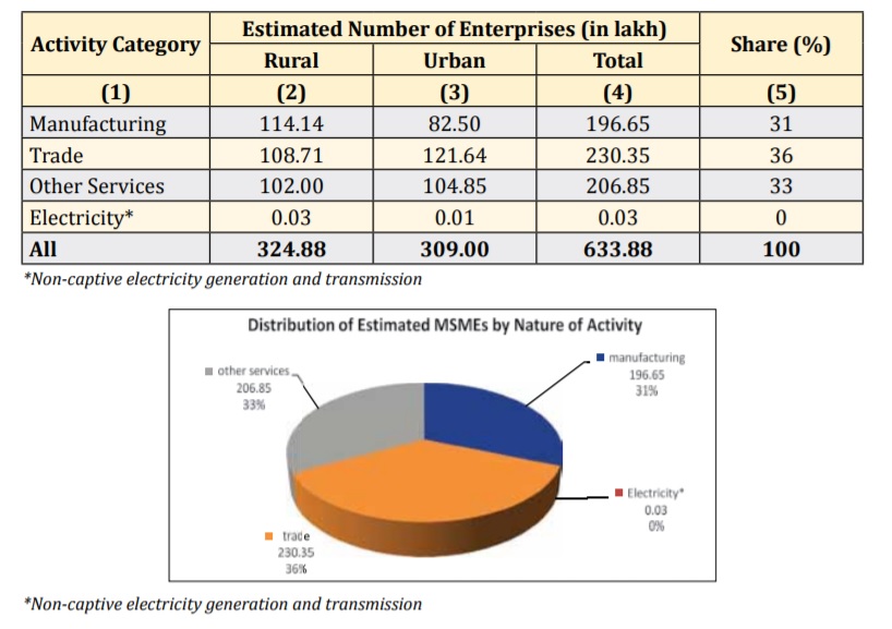 31% MSMEs were found to be engaged in Manufacturing activities, while 36% were in Trade and 33% in Other Services. Again out of 633.88 estimated number of MSMEs, 324.88 lakh MSMEs (51.25%) were in rural area and 309 lakh MSMEs (48.75%) were in the urban areas.